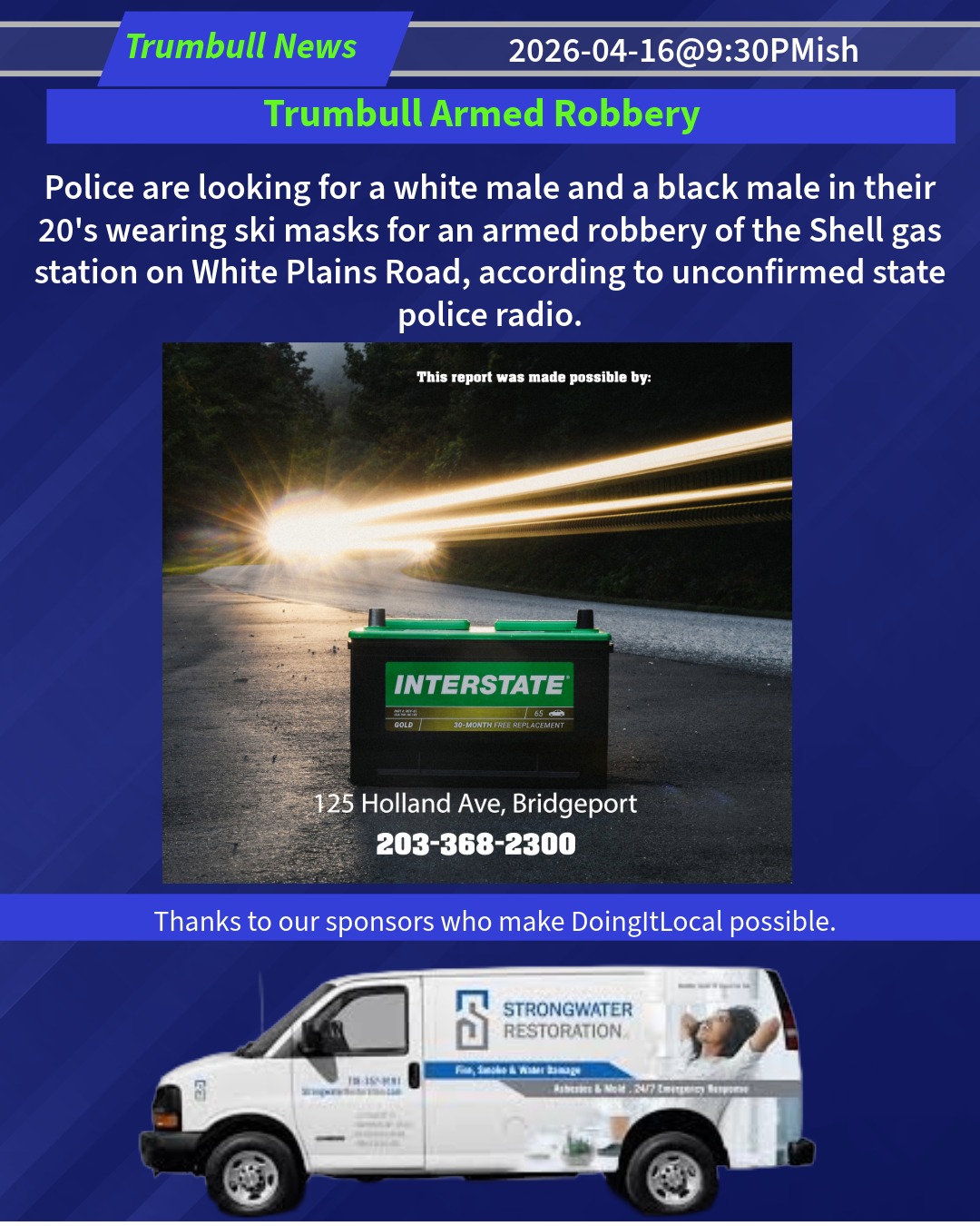 Police are looking for a white male and a black male in their 20's wearing ski masks for an armed robbery of the Shell gas station on White Plains Road, according to unconfirmed state police radio. 2026-04-16@9:30PMish #Trumbull #robbery #TrumbullNews