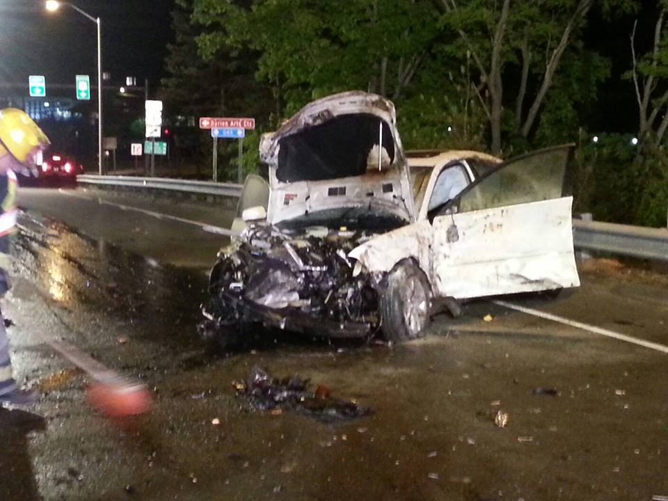 Updated photo—2:00am–#Darien CT #cttraffic–Tonight’s car fire is on I-95 southbound at exit 12. A one car crash, everyone out of the vehicle.