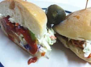 WOODS END Barbecued pulled pork and house made slaw in a Portuguese roll.