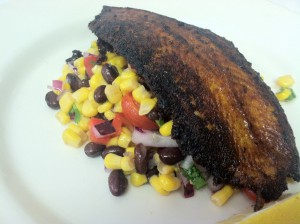 Woods End Blackened Catfish over Corn and Black Bean Salad.