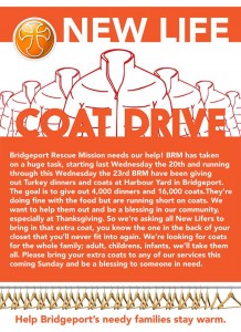 New Life Church at 28 Hedgehog Road, Trumbull will be partnering with Bridgeport Rescue Mission. Bring a coat to any Sunday Service 8:30 – 10:30 or 11:30am 6:00pm.