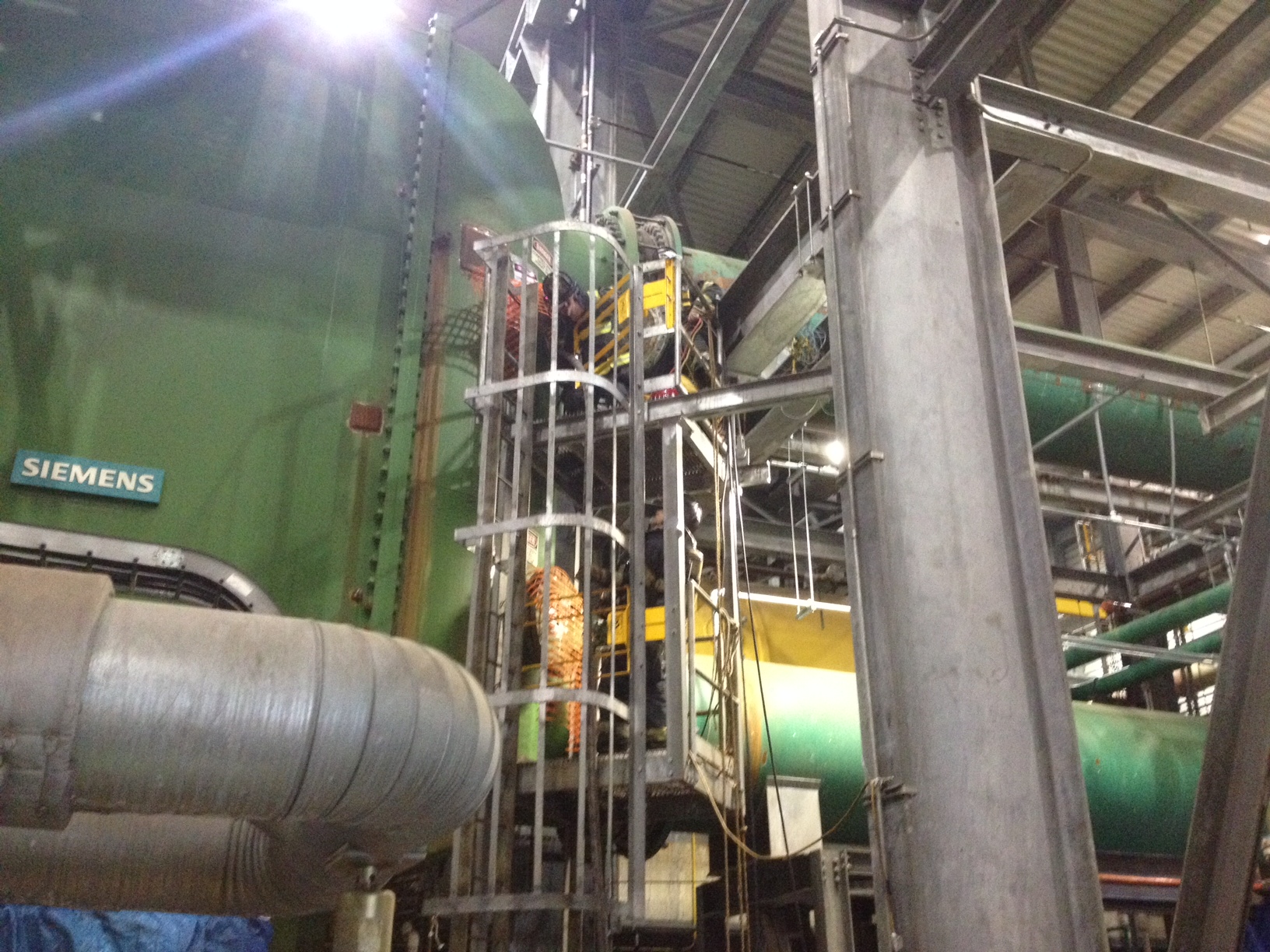 Firefighters had to climb about 40 feet up to access the pipe. Several firefighters traversed a catwalk to reach the area where the fire originated. Others worked to put water inside the pipe to extinguish the problem.