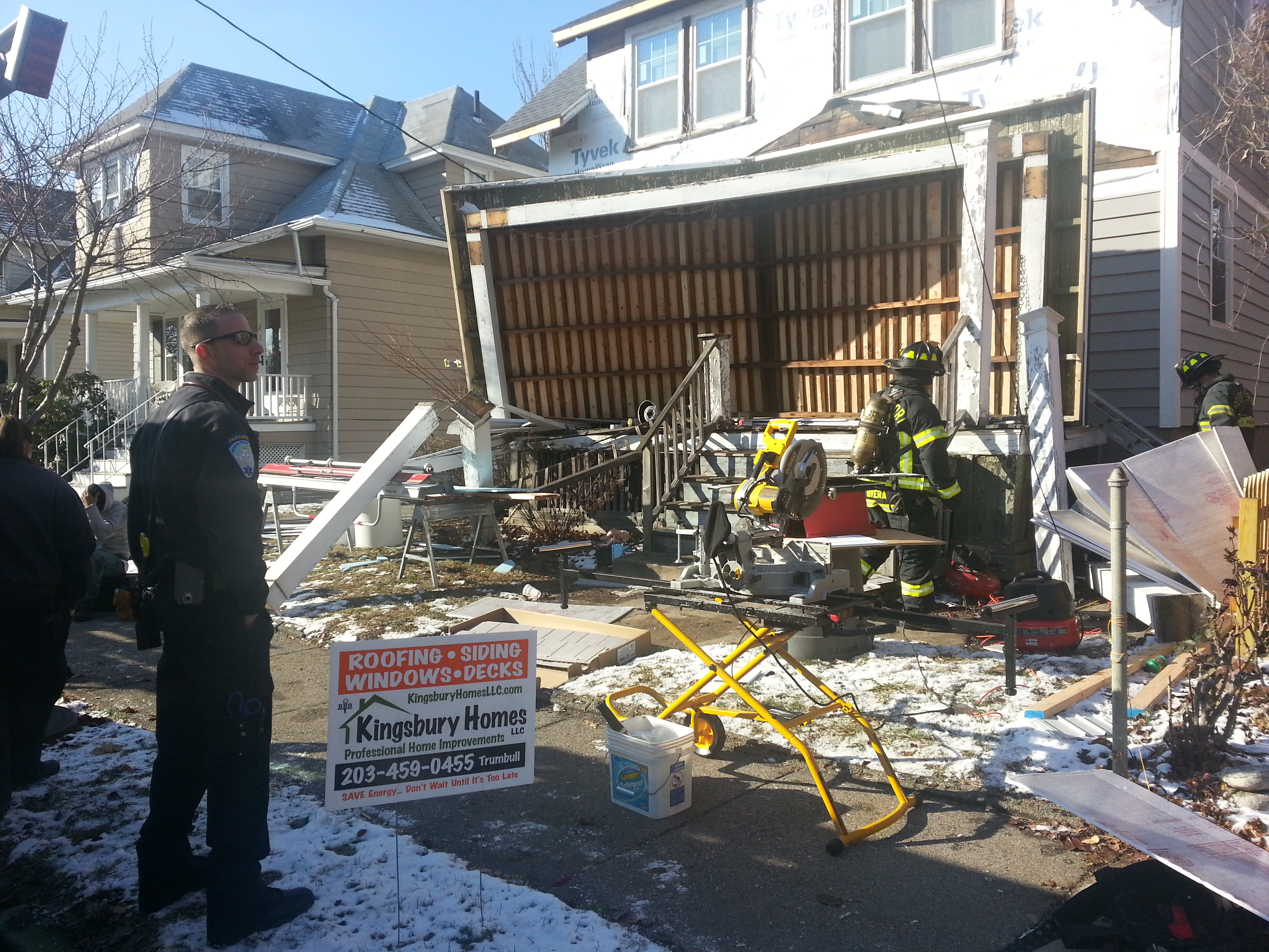 10:57am–#Bridgeport CT–Report of a building that has collapsed at 41 Harborview Place. UPDATE– This was a partial building collapse, a construction worker fell in the process, has only minor injuries, there is no further risk of collapse. The house was under remodeling and as you can see the beam to the left in the picture split in two. Fire marshall and building inspector are investigating.