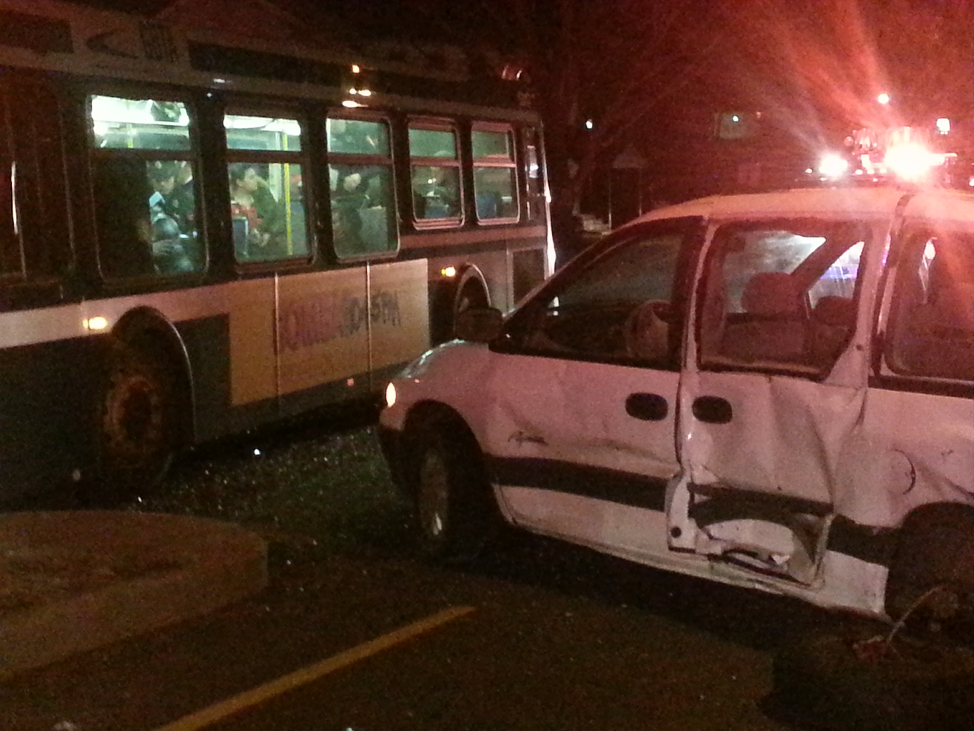 8:11pm–#Bridgeport CT–Several people were injured when an SUV and a bus collided at the intersection of Park and Suburban Avenue. It appears that the SUV was coming out from Suburban Avenue and pulled out in front of the bus and the SUV was T-boned by the bus. A count from radio reports are that three people were transported to Saint Vincent’s Hospital and seven refused medical treatment. This is preliminary information and should not be considered accurate. The intersection in both directions has been closed.