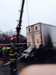 I-95 northbound by Exit 22 near the rest area. Fairfield Fire Department Engine 1, Ladder 1, Engine 2, Ladder 2, and Car 3 responded. Company 1 and Car 3 arrived on scene at approximately 06:34 and reported a very serious multi-vehicle accident, a car was under a trailer truck, the car was on fire, and one occupant was entrapped in the vehicle. Assistant Chief Schuyler Sherwood assumed command of the incident. Engine 1 immediately controlled the fire. Extrication was initiated utilizing multiple hydraulic rescue tools. Access was rapidly gained to the single occupant of the vehicle and it was determined that she had no pulse. The fire department initiated an operation to lift the trailer off of the car. Westport Fire Department and Fairfield Engine 4 were requested to the scene for assistance with the extrication. A heavy duty wrecker from Buds Towing was also requested to the scene to lift the trailer off of the car. The heavy duty wrecker 21 lifted the trailer off of the car. The scene required at least 24 emergency response personnel to extricate the operator. Fire Chief Richard Felner was on scene during the entire operation supporting as a liaison with the State Police. American Medical Response arrived shortly after the fire department. State Police remained on the scene completing their investigation after the Fire Department left. The Fire Department remained on scene until approximately 08:30.