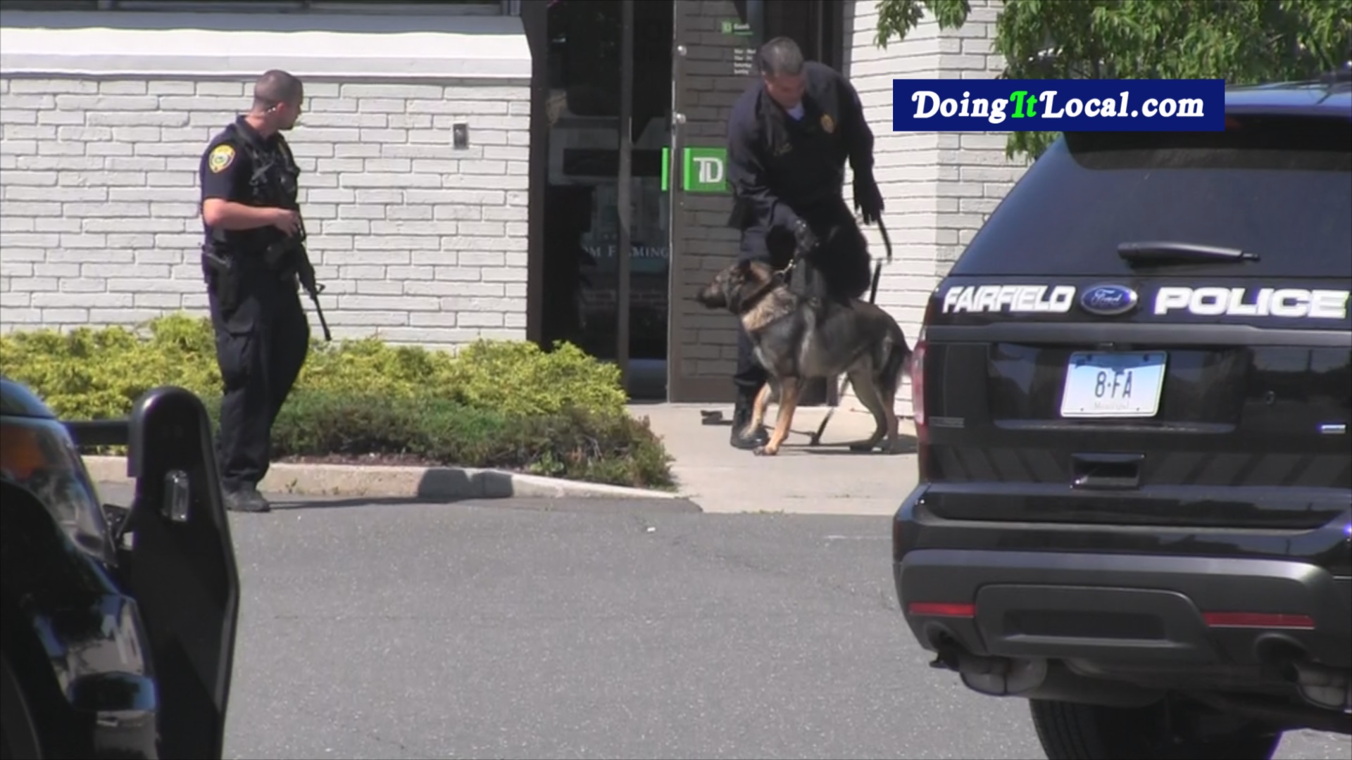 3:00pm–#Fairfield CT– Around 3pm Sunday the TD Bank on the Post Road was robbed at gunpoint by a young skinny black male. He is a young male, 17 to early twenties. The suspect fled out the back door with an undetermined amount of cash. K-9 Officer Kevin Wellls and K-9 Ruger tracked the suspect but lost his scent on Ruane Street.