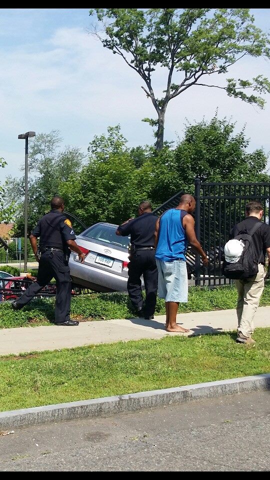Alex A. enviou esta foto de um carro quase tombado para o lado em acidente no Bridgeport Hospital perto da sala de emergência na Mill Hill Avenue. Alex disse que havia duas pessoas de idade no carro.