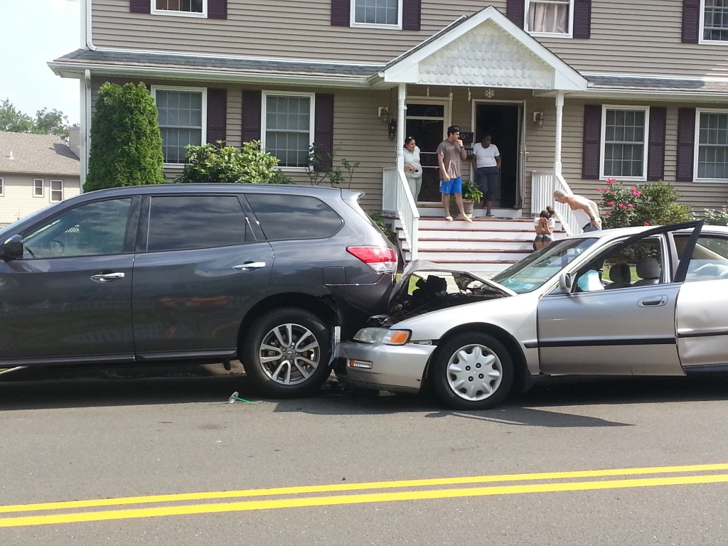 4:02pm–#Fairfield CT–A car hits a parked minivan on Jennings Avenue and the street formerly known as Prince. Driver was bleeding from the mouth, probably from impacting the airbags. Police and firefighters just arrived.