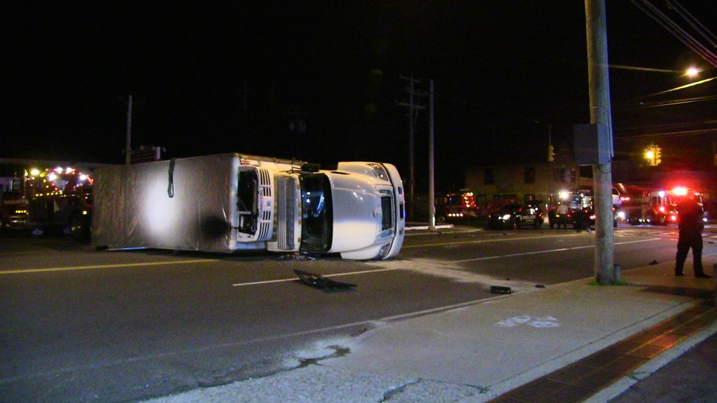1:33am–#Fairfield CT–The Post Road was closed Sunday morning due to a rollover crash in front of Geronimo’s Restaurant at 2070 Post Road. A commercial refrigerated truck rolled over after hitting a silver Volkswagen station wagon. Injuries unknown at this time.