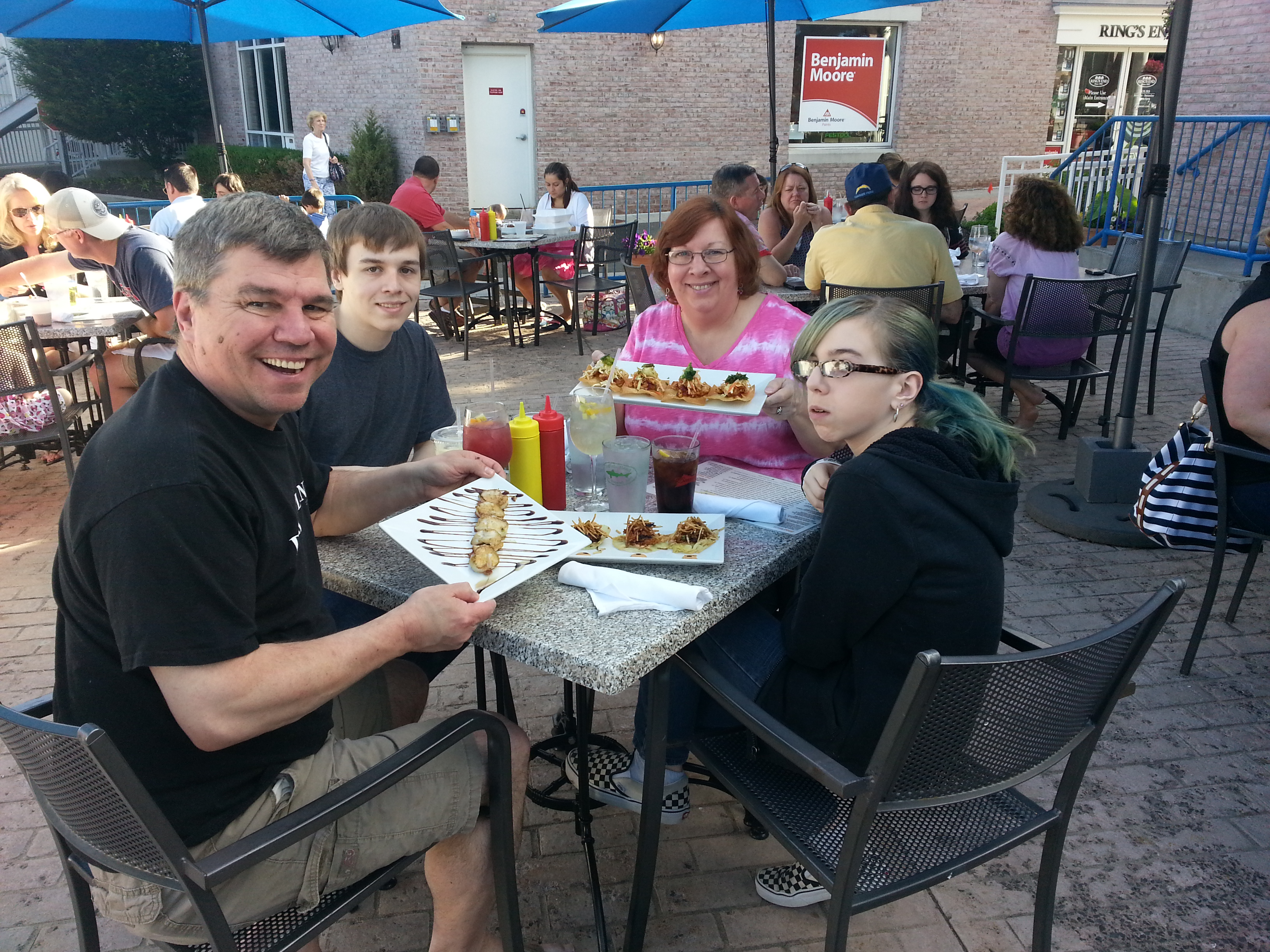 Foi uma bela noite que escolhemos para comer no deck. Grande pedida, as sangrias branca e vermelha que eu e minha esposa pedimos junto com o tempo foi uma reminiscência de umas férias tropicais, exceto para as crianças. Os aperitivos pedidos foram grandes. Eu posso me ver parando no bar mais uma noite para tomar uma bebida e ter apenas aperitivos para o jantar. Você tem que tentar os Wontons asiáticos, eles são muito saborosos. Também nós pedimos as scallops que foram, provavelmente, as mais macias que eu já comi.