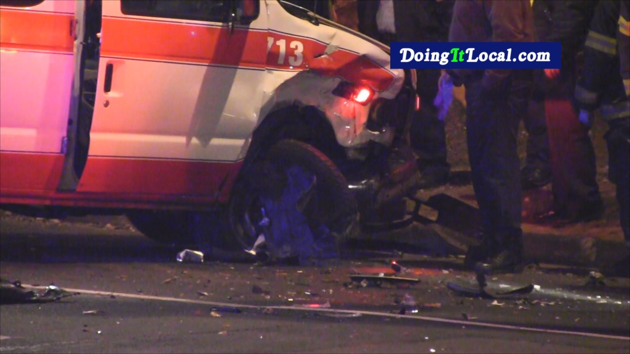 AT11: 45pm a tripulação EMS chamado de volta ao seu centro de expedição que eles estavam envolvidos em um acidente na I-95 na rampa de Fairfield Avenue com um SUV prata. Outra ambulância foi enviada para a pessoa com dores no peito imediatamente. Não se sabe a condição do pessoal EMS, o motorista ou passageiros do SUV no momento.