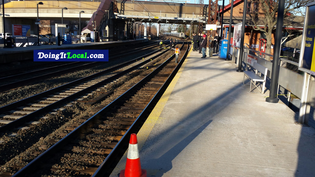 5:35pm–#Fairfield CT–A 31 year old woman was on the north side platform at the Fairfield train station downtown Fairfield, she realized she need to be on the south side to catch her train. Others on the platform tried explaining to her how to get to the stairway the goes over the tracks. Witnesses say she was panicked that she was going to miss her train and that she disregarded their instruction and went to cross the tracks. When she got to the other side of the tracks she could not figure how to scale up to the platform. At that time an Amtrak train approached and was blowing the train’s horn. She dove under the platform but she may have panicked and was hit by the train and killed. In the picture at the bottom of the frame you will see a traffic cone. That is where she was struck. You can see a yellow tarp in the middle of the frame that covered her body (near the man in the orange vest), and you can see the distance it took for the train come to a stop. The Amtrak train was a Boston to Washington D.C. train. The tracks were closed until around 6pm. The name of the woman has not been released until notification to her family.