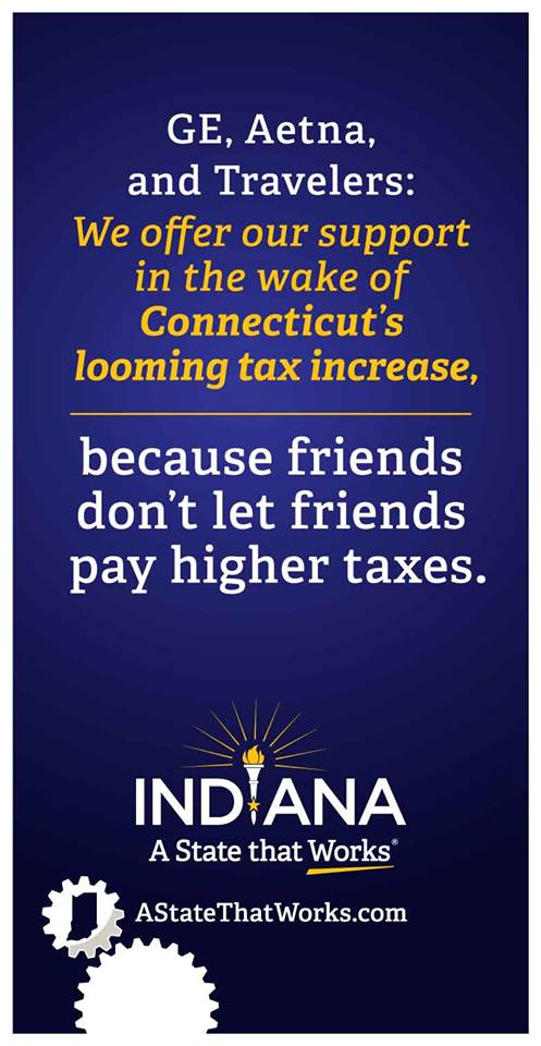 O Estado de Indiana publicou um anúncio de página inteira no Wall Street Journal quarta-feira para a General Electric Co., Aetna Inc. e os Travelers Companies Inc. O anúncio dizia Indiana está oferecendo seu “apoio na esteira do iminente aumento de impostos de Connecticut , porque os amigos não deixam amigos pagar mais impostos “.