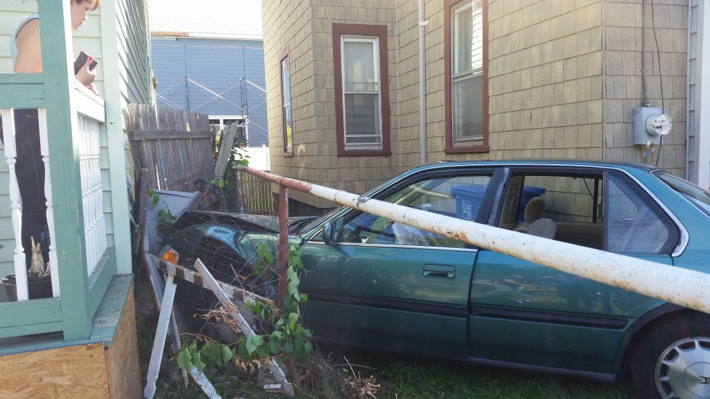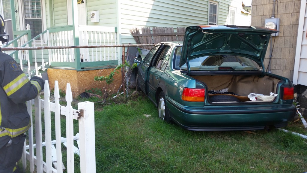 2:44pm–#Bridgeport CT– Police are investigating the cause for this car crashing into 404 Arctic Street. Â The house received minor foundation damage.