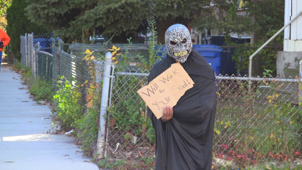 1:01pm–#Bridgeport CT–Police were dispatched to Gregory and Park Avenue for a man in a mask and cape with a sign saying “I’ll Eat Your Soul” according to radio reports. The sign actually read I’ll Work For Your Soul” and when I arrived I found Derrick and his friends having fun with people passing by the corner store. Thank you Derrick for a fun start to my reporting day! The world needs more Derricks!