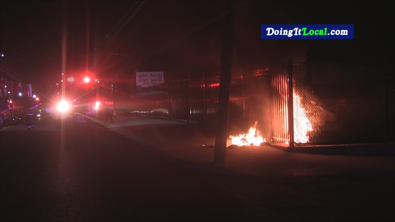 10:58pm–#Bridgeport Connecticut–Police on patrol discovered a car fire at the M&F Auto Body Shop on North Avenue and called the fire department. Within minutes of the firefighters arrival they quickly had the fire extinguished as with most car fires. You can see that trash was pushed under the fencing to start the blaze. The intersection was closed for a short amount of time but it caused no delays in the area.