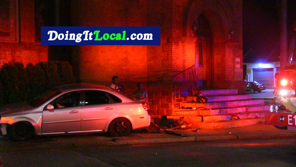 9:40pm–#Bridgeport Connecticut– Police are investigating what appears to be a one car crash into the stairs at the Olivet Congregational Church at Main and North Avenue. There did not appear to be any injuries. I hope they are in good hands and all is forgiven!