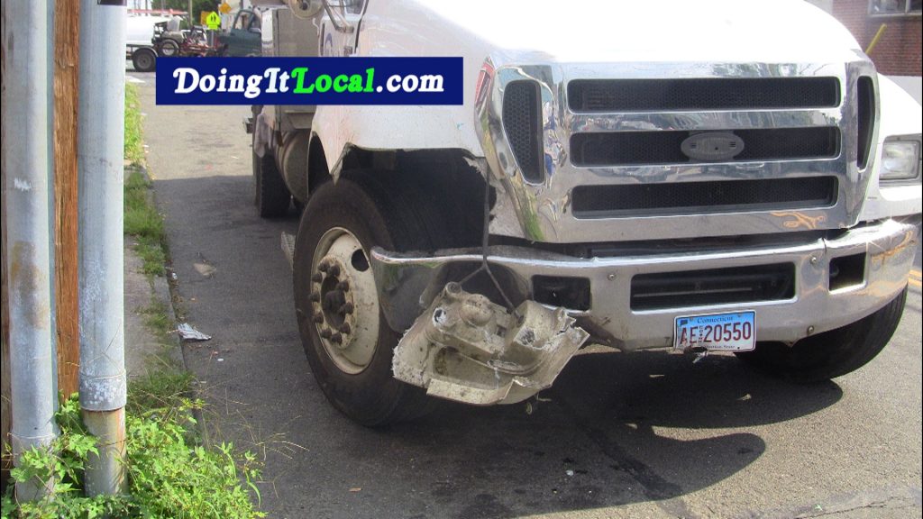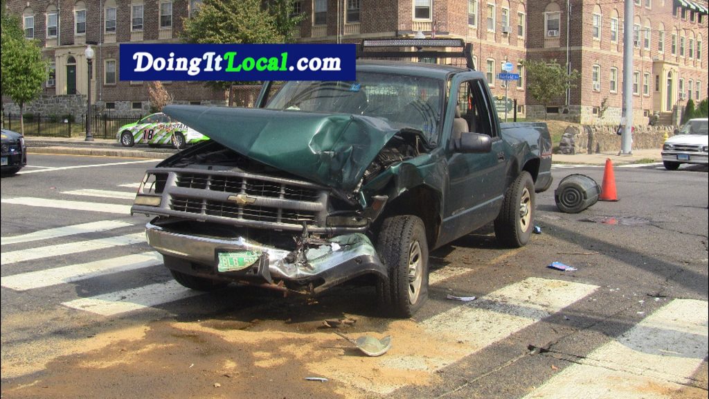 2:35pm–#Bridgeport Connecticut– Police investigate a crash at the intersection of Brewster and Fairfield Avenue. The driver of the green truck was injured and taken to the hospital by EMS.