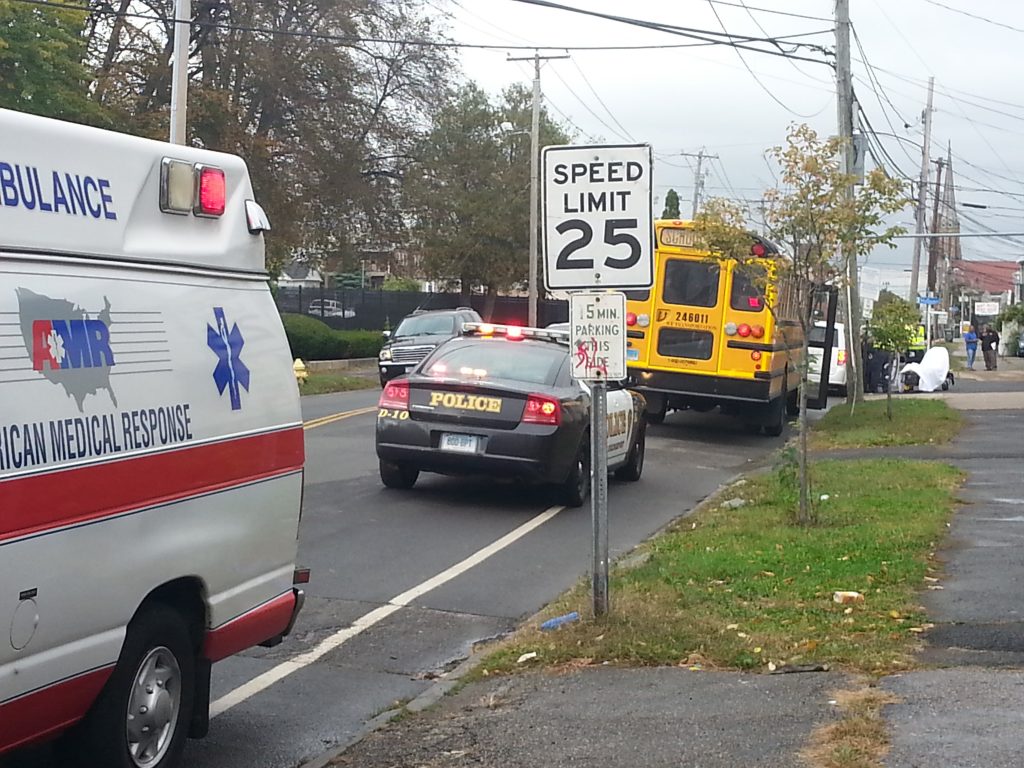 3:42pm–#Bridgeport Connecticut– Police are investigating a crash between a minivan and a school bus on North Avenue near Madison Avenue.. EMS was seen preparing the occupants of the minivan for transportation to the hospital. None of the children on the bus were injured. A sign on the side of the bus said FCW-11 and Cesar Batalla 35-B.