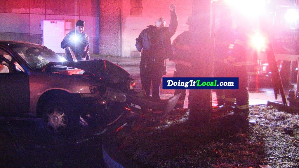 10:11pm–#Bridgeport Connecticut– Police inspect the damage to a utility pole that was struck by a car a Wells and North Avenue. Police said the driver suffered facial cuts in the crash.