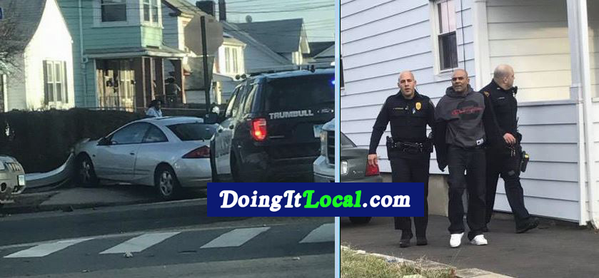 3:43pm–#Bridgeport Connecticut–#Trumbull Connecticut– Trumbull Police were in a 40mph pursuit into Bridgeport where the suspect vehicle crash at Summit and Lindley Street. A short foot pursuit ensued but the Trumbull Officer had the suspect in custody at gunpoint behind 1122 Lindley Street. The suspect was wanted for an alleged larceny. Great photos sent in by a viewer who wanted to remain anonymous.