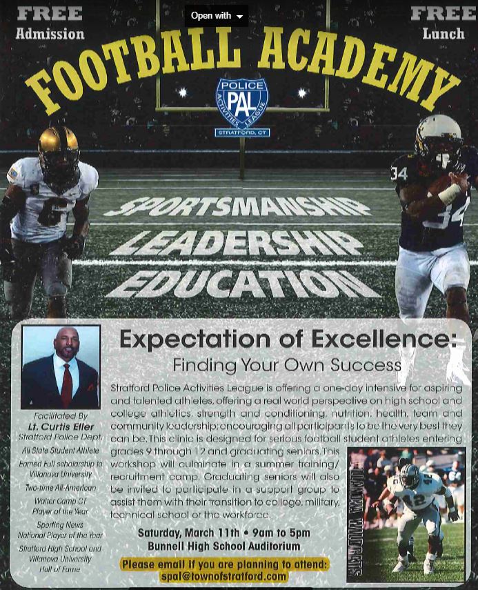 #Stratford Connecticut–Lt. Curtis Eller of the Stratford Police Department will be hosting a one day football clinic at the Bunnell High School Auditorium on Saturday, March 11, 2017. The event is open to students’ grades 9 through 12. The academy will run from 9am-5pm. If interested please contact Lt. Eller at spal@townofstratford.com