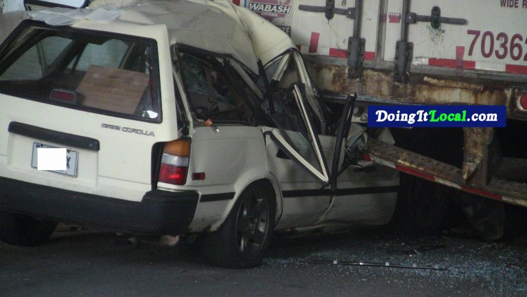 7:28pm–Motor vehicle accidents continue to dominate the breaking news today. Witnesses to the accident told me the white Toyota station wagon was allegedly driving at a high rate of speed and ran the stop sign at Smith Street and slammed into a parked tractor trailer on Newfield Avenue near Orange Street. The driver, a woman was unresponsive and trapped requiring firefighters to extricate her. Her condition is not known at this time.