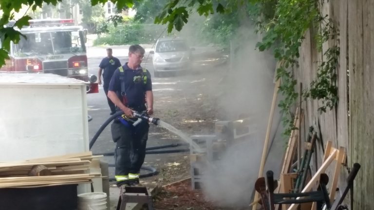 11:11am–#Fairfield CT– Firefighters douse a fire in the back of Calvary Church on Kings Highway East.  A witness told me he saw a fourteen inch by fourteen inch box on fire when he called the firefighters.  A steady breeze kept and debris kept the embers alive.  Exit 24 off I-95 is next to this area.