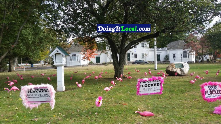 #Fairfield CT– If you drove by town hall on the Old Post Road on Friday you would have noticed an invasion of pink on the front lawn. I contacted First Selectman Mike Tetreau who told me to contact the Park and Recreation Department. I called and was told the woman I needed to speak to went to lunch, I have not heard back from her by the end of day. So I looked up “You’ve Been Flocked” on Google and http://youvebeenflocked.com/