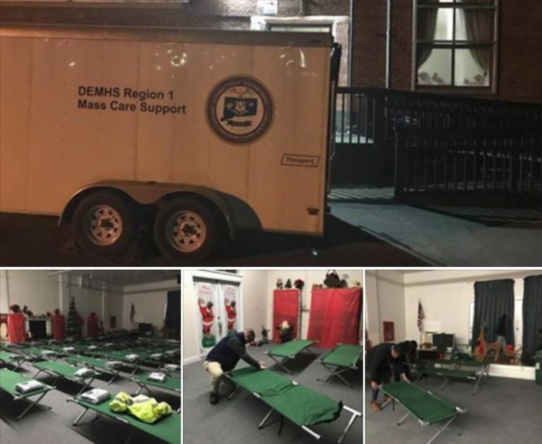 10:30pm–12/29–#Bridgeport CT– Cots and bedding for 50-100 people were made ready for residents of Success Village when a steam pipe ruptured. Special thanks to Rich Paoletta for the photos.