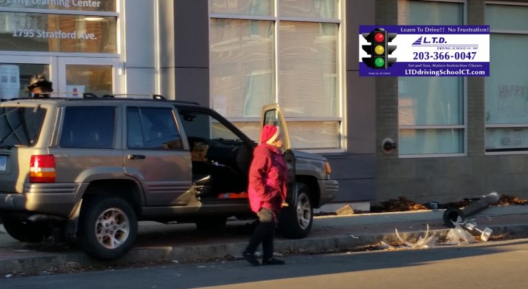 3:33pm–#Bridgeport CT– A elderly woman drove her Jeep SUV up on the side walk at Stratford Avenue and Freeman Street knocking down a light pole.
