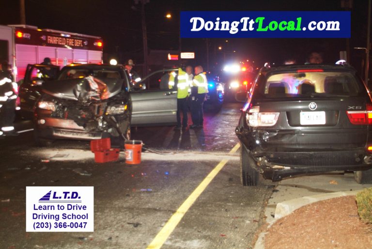 1:34am–#Fairfield CT– There were no reported injuries in this crash on the Post Road at the Circle in front of McDonald’s.