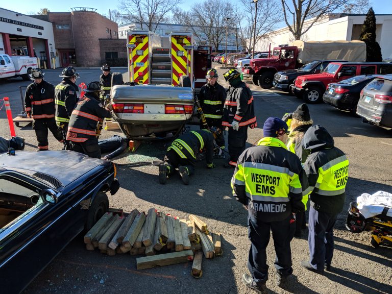 #Westport CT– Last week Westport firefighters conducted training on some new rescue equipment, at Fire Headquarters. New stabilization and lifting struts were put through their paces in different scenarios as firefighters became familiar with the use and application of the new equipment. Mannequins were used to simulate entrapment of a person under a vehicle. As part of the training, Westport EMS personnel were invited to attend and become part of the realistic scenarios being performed. EMS personnel were able to observe the firefighters performing the extractions, establish their own plans for treatment of the patients based upon expected traumatic injuries and were then able to perform simulated treatment on the patients after removal.