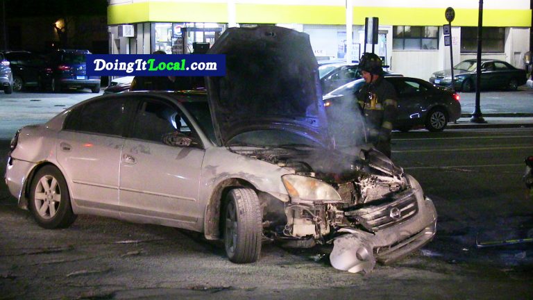 11:50pm–#Bridgeport CT– Today’s vehicle fire was on Fairfield Avenue near Albion Street. A witness told me the car hit a tree in the road divider in front of Krausers a little over a half mile away before the car caught fire. A person in the nearby store helped put the fire out with a fire extinguisher. The fire department also used dry chemical extinguisher instead of water so there would be no freezing.