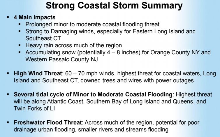 Strong Costal Storm Forecasted to Impact Area this Friday March 2nd 2018 A Costal Flood Advisory has been issued by the National Weather Service for our area for Friday Morning to Saturday Evening. Minor to moderate flooding is expected in the most vulnerable locations near the waterfront and shoreline. Expect around 1.5 to 3 feet of inundation above ground level in low lying, vulnerable areas. Roads and low lying properties including parking lots, parks, lawns and homes/businesses with basements near the waterfront should expect some flooding. There is currently low to moderate confidence on the magnitude of coastal flooding Friday Night, but potential remains for minor coastal flooding. Moderate confidence continues in potential for minor to locally moderate coastal flooding during the times of high tide Saturday. The magnitude of the coastal flooding Friday Night into Saturday is dependent on track and intensity of the storm. With the current forecast for Minor to Locally Moderate Coastal Flooding Expected Friday Morning the Westport Fire Department encourages Westport residents and business to be prepared for possible flooding in areas prone to minor coastal flooding. A High Wind Warning has been issued for the region with gusts forecasted for the area to be 45-55 mph. Strongest winds Friday afternoon through Friday night capable of downing trees and power lines may cause power outages. There is also a Flood Watch in effect for Friday and Saturday with 2 to 3 inches of rain forecasted with localized higher amounts. The Westport Emergency Management Team continues to monitor the forecast and are in contact with the National Weather Service and The Connecticut Department of Emergency Management Homeland Security. Information and forecasts available from The National Weather Service https://www.weather.gov/okx/ Additional updates will also be posted on the Westport Fire Department Facebook page https://www.facebook.com/westportctfire