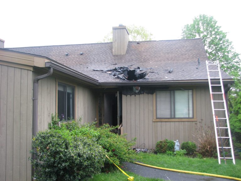 #Stratford CT—A fire was extinguished Monday morning at 45 Buckskin Lane that caused extensive damage to the roof. The fire was contained to one side of a two-unit condominium and was extinguished within 20 minutes of the arrival of the Fire Department. At 5:37 AM, Firefighters were dispatched to the above address for a report of a fire coming through the roof. The Engine 4 Crew arrived to find a significant amount of smoke and fire from the roof above the front entryway. The Crew conducted a search of the residence and found the owner asleep in bed and unaware of the emergency; she was evacuated to the outside and treated for non-life threatening exposure from the smoke. Under the command of Assistant Chief Camperlengo, the fire was contained to an area above the front entry and the roof of 45B Buckskin Lane. The Fire Marshal’s Office has determined that an exterior light fixture had failed and burned through the exterior wall into the attic and through the roof. The owner will be displaced until repairs to the roof can be made and the interior of the property can be cleaned.