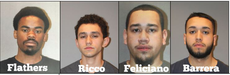 #Stratford CT–Four Stratford residents, Dontrel Flathers (age 22), Jacob Ricco (age 21), Jalenthen Feliciano (age 22) and Sergio Barrera (age 21) were arrested after Officers responded to 3 rd Avenue in the Lordship area of Stratford on the report of a possible burglary in progress. The neighbor who witnessed the attempted break in gave a description of the suspects and their car to the responding Officers. The information was relayed to other officers and a short time later a Volkswagen Jetta matching the description of the suspect’s vehicle was stopped on Lordship Boulevard near Access Road. The witness was able to positively identify the suspects and the initial description of the suspects, their clothing and car all matched the subjects at the scene of the motor vehicle stop. During the stop Officers also found that Driver of the car, Feliciano was in possession of marijuana. Feliciano was charged with Sale of a Controlled Substance, Conspiracy to Commit Burglary 3 rd and Criminal Attempt to Commit Burglary 3 rd . He was held on a $5000 dollar bond. Flathers was charged with Criminal Tresspass3rd and Criminal attempt at Burglary 3 rd . He was held on a $5000 dollar bond. Berra was charged with Criminal Tresspass3rd and Criminal attempt at Burglary 3rd. He was held on a $5000 dollar bond. Ricco was charged with Criminal Tresspass3rd and Criminal attempt at Burglary 3rd. He was held on a $5000 dollar bond.