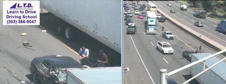 2:18pm–#cttraffic–#Westport CT– It appears a car allegedly rear-ended a tractor-trailer on I-95 southbound near exit 18 in the left and center lane backing up traffic. 3 ambulances have been dispatched to the scene.