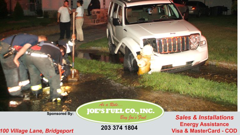 11:11pm–#Bridgeport CT– A jeep hit a hydrant in the 400 block of Westfield Avenue. It must have snapped at the base a few feet below. The firefighters are attempting to shut the water off feeding the hydrant from the street.