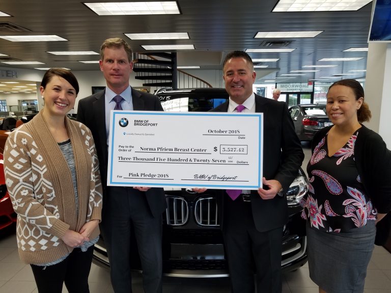 #Bridgeport CT– Last month we told you that BMW of Bridgeport was making a donation for every car purchased in the month on October to the Bridgeport Hospital Norma Pfriem Breast Center. Today, Mitch McManus, President of BMW of Bridgeport and General Manager Tim Kraemer presented the Center with a check for $3,527.42. Way to go!