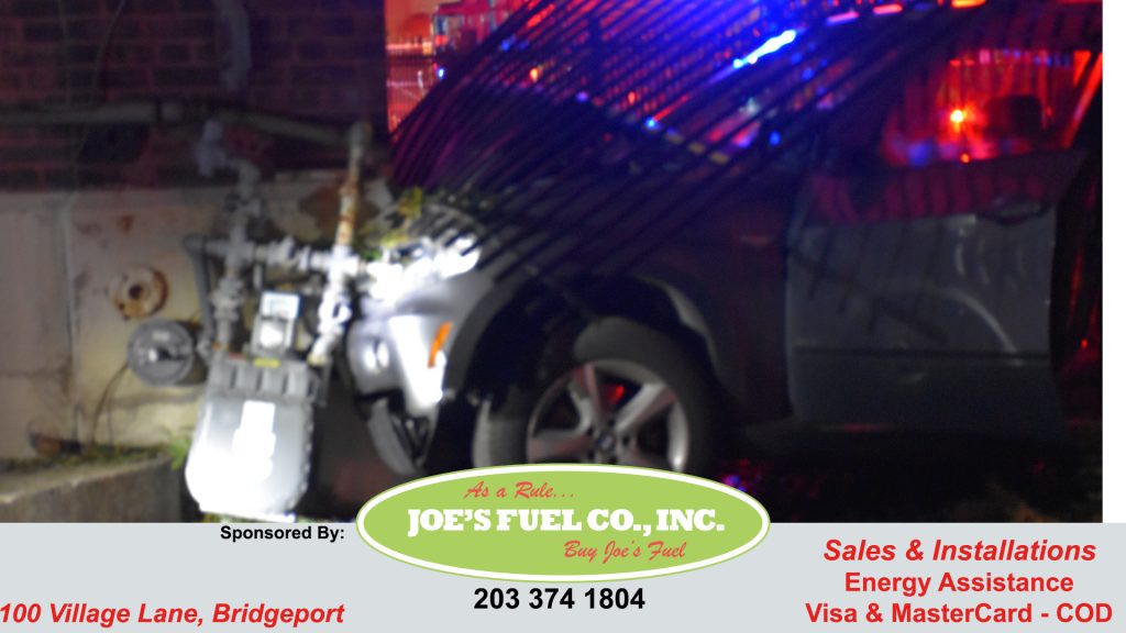 7:19pm–#Bridgeport CT– A man was injured and transported to the hospital when his beautiful BMW X-5 hit the building on the Williston Street side of 861 Union Avenue. A Google search said it is the Bridgeport Screw Company. The gas main was also struck and gas company officials turned the gas off. Firefighters are waiting for a someone with a key to open the building so they can inspect for any structural damage.