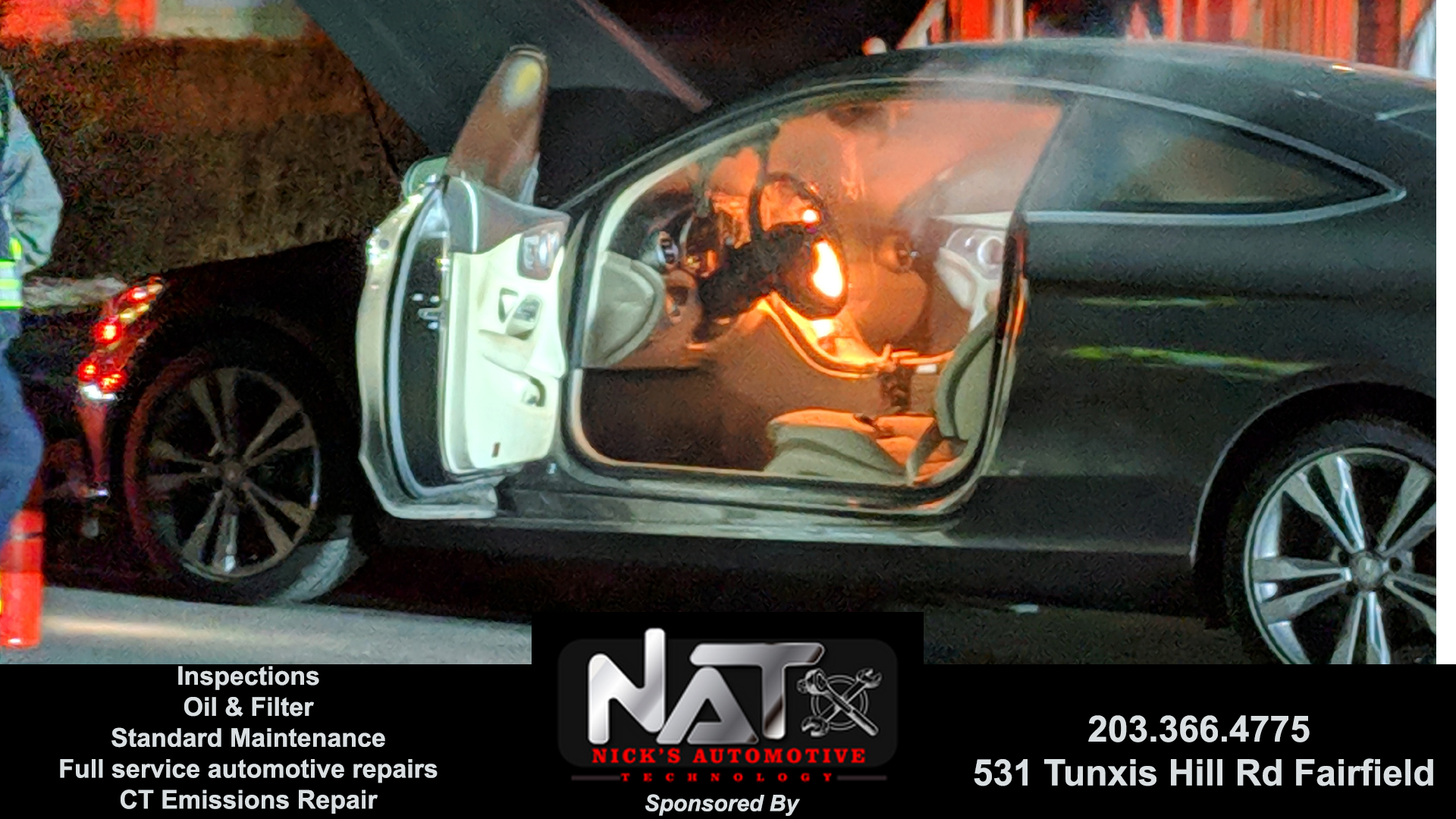 6:44pm–#Fairfield CT– A dry chemical extinguisher was not enough to put out this fire in the console of this car on Moody Avenue. It was put using a fire hose. I guess you can say this car went from hot rod to car pool…