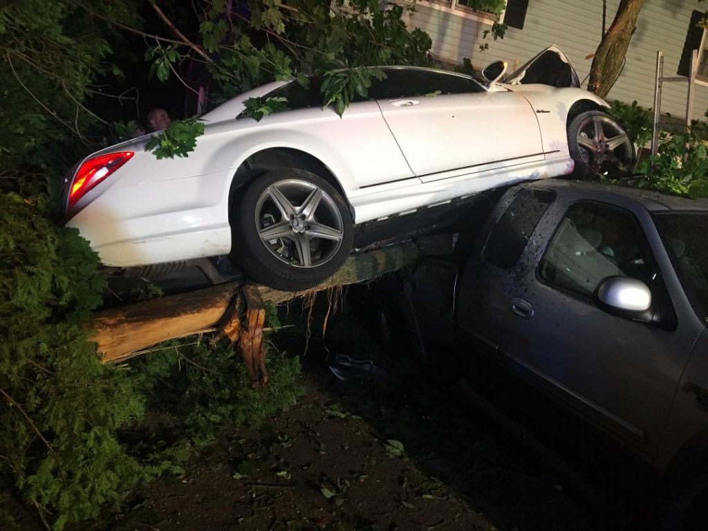 2019-06-06–#Norwalk CT–Norwalk Fire responded to a reported motor vehicle accident with entrapment on 59 Winfield st. The car coming south bound at a high rate of speed went off the road through several trees, then landing on top of a pickup truck in the driveway next to the house smashing the window of the home. The two occupants were removed from the car and transported to Norwalk Hospital. The extent of their injuries and their identification is not know at this time. Occupants of the home were not injured. PD is still on scene doing the investigation.