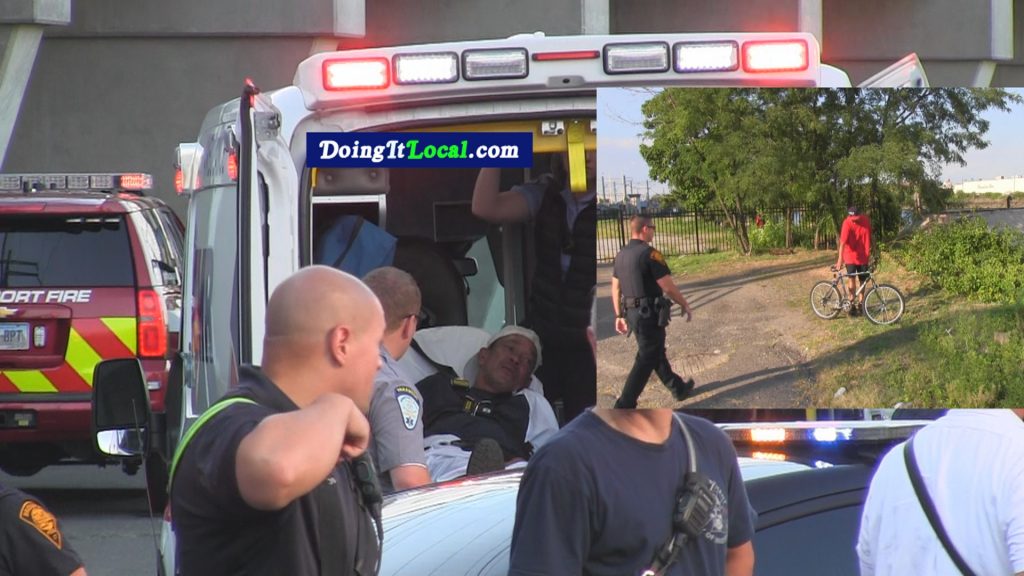 2019-08-30–5:28pm–#Bridgeport CT– A man suffered from a long fall from the Stratford Avenue Bridge when he attempted to throw his bicycle down the embankment (don’t ask) he kept going down and was injured. He was alert and talking with first responders.