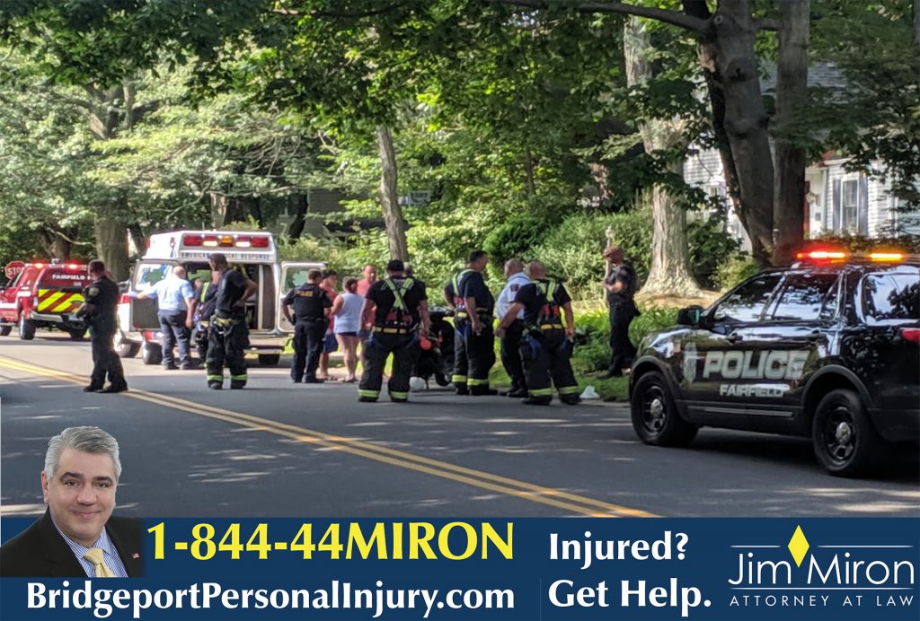 2019-08-17@ 3:40pm–#Fairfield CT– Another collision between a car and a motorcycle on Morehouse Highway near Wildwood Road. The motorcyclist was transported to the hospital with a possible broken ankle.