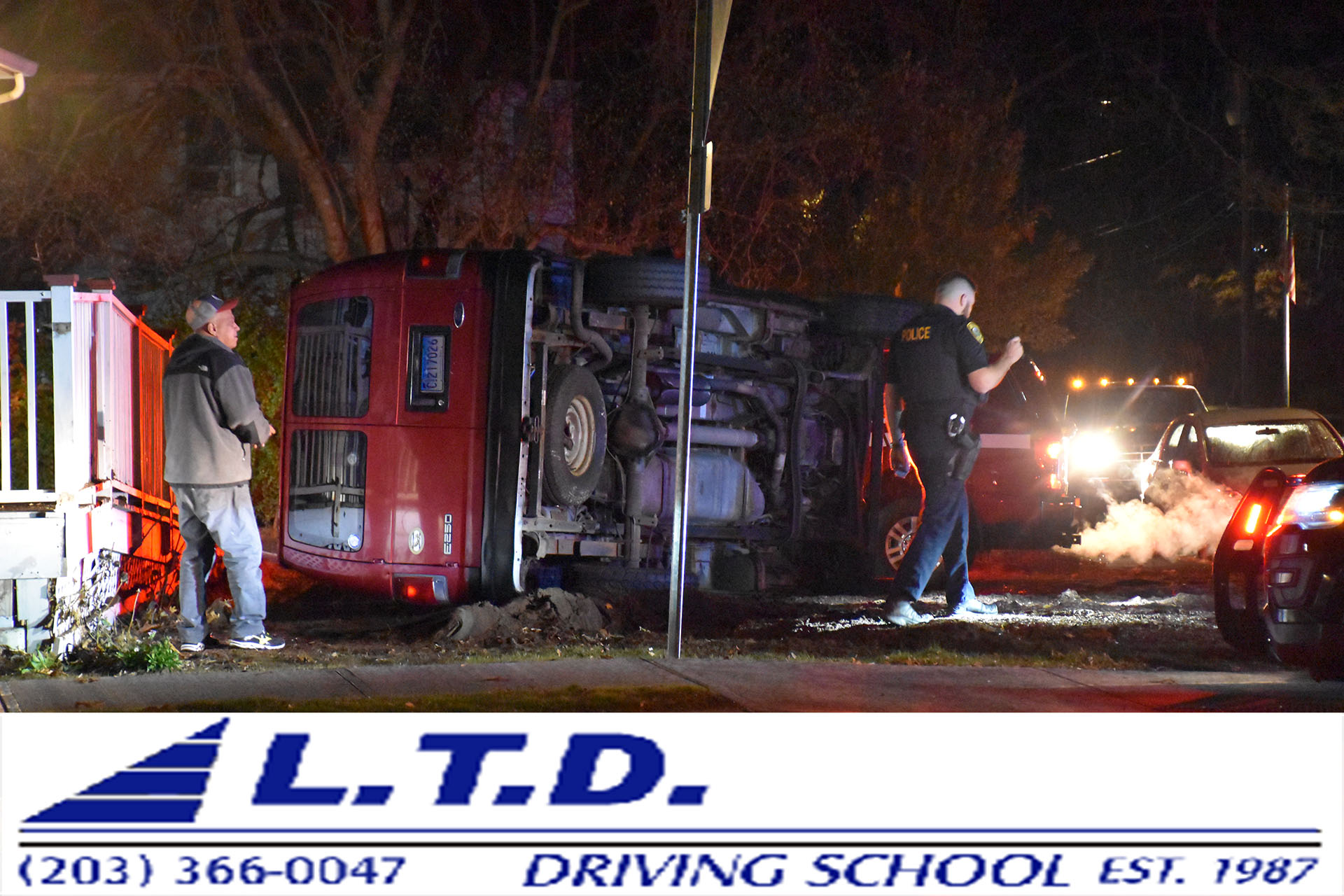 2019-11-23@10:25pm–#Fairfield CT– First responders are on the scene of a van rollover on Kings Highway at Hibiscus Street which is across the street from St. Emery’s Church.