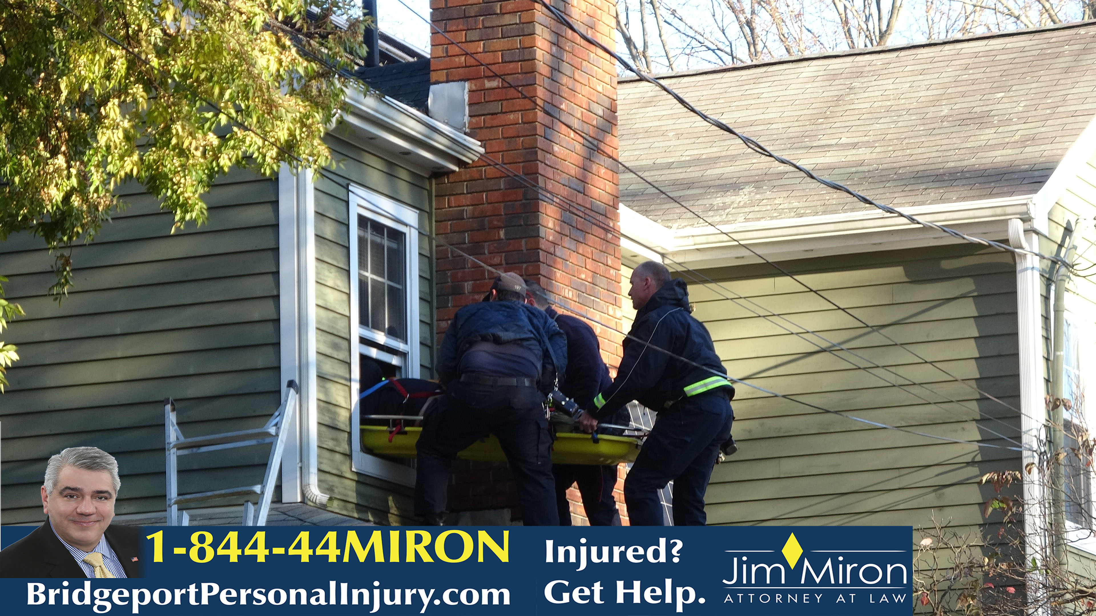 2019-11-08@3:10pm–#Fairfield CT– A worker fell about 10-12 feet from one roof onto another possibly breaking his ankle (radio reports said his ankle was deformed) in the 200 block of Elm Street. First responders got him on a stokes stretcher, transported him into the house through a bedroom window.