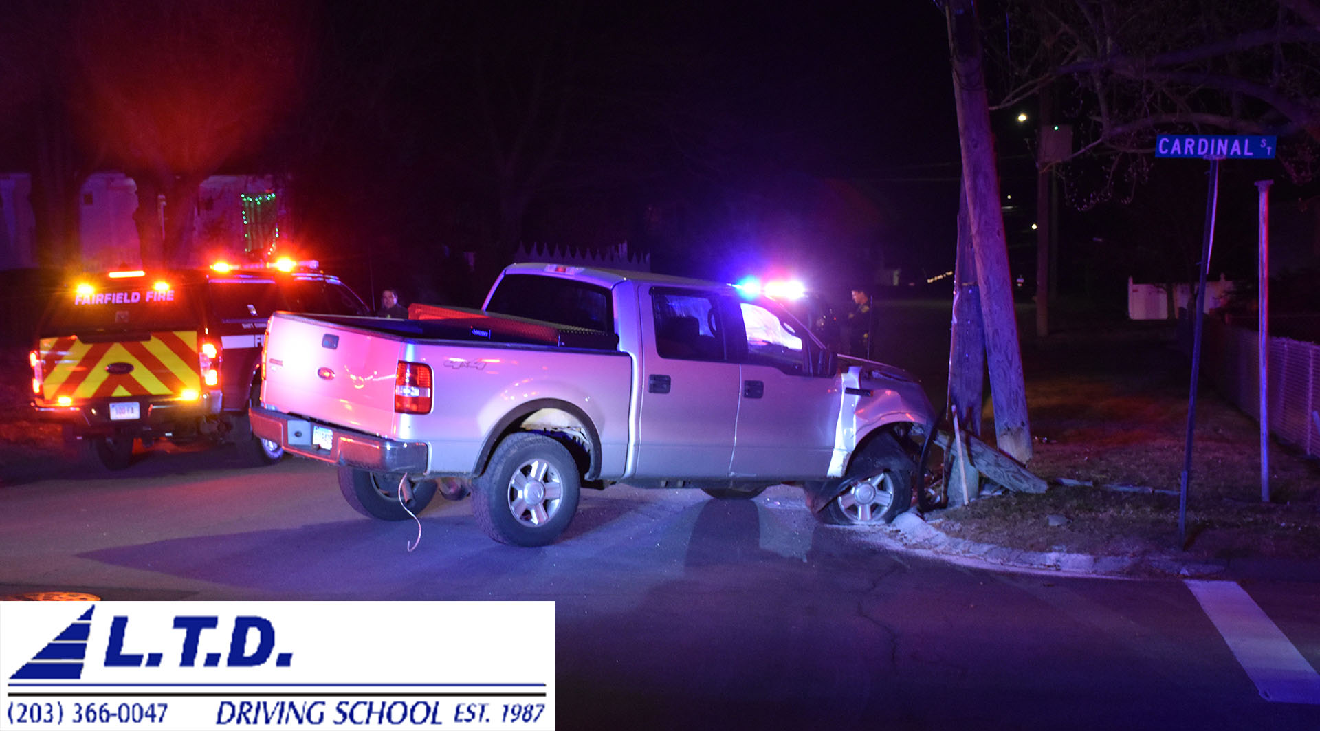2019-12-07@10:44pm–#Fairfield CT– A single vehicle accident, a pickup truck hit a utility pole at Cardinal Street and Lenox Avenue. The driver was transported to the hospital. On November 25th there was a rollover accident at the same intersection.