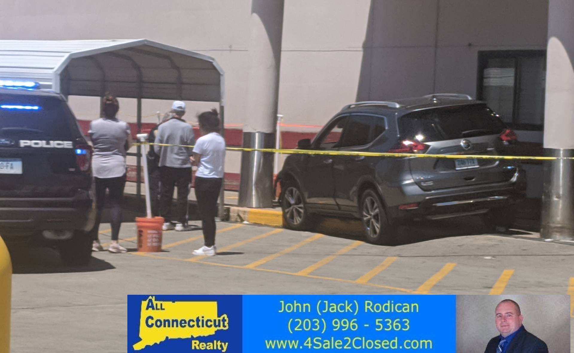 2020-05-24@1:38pm–#Fairfield CT– A car has hit a column outside BJ’s Wholesale Club on Black Rock Turnpike. The building inspector has been called to the scene.