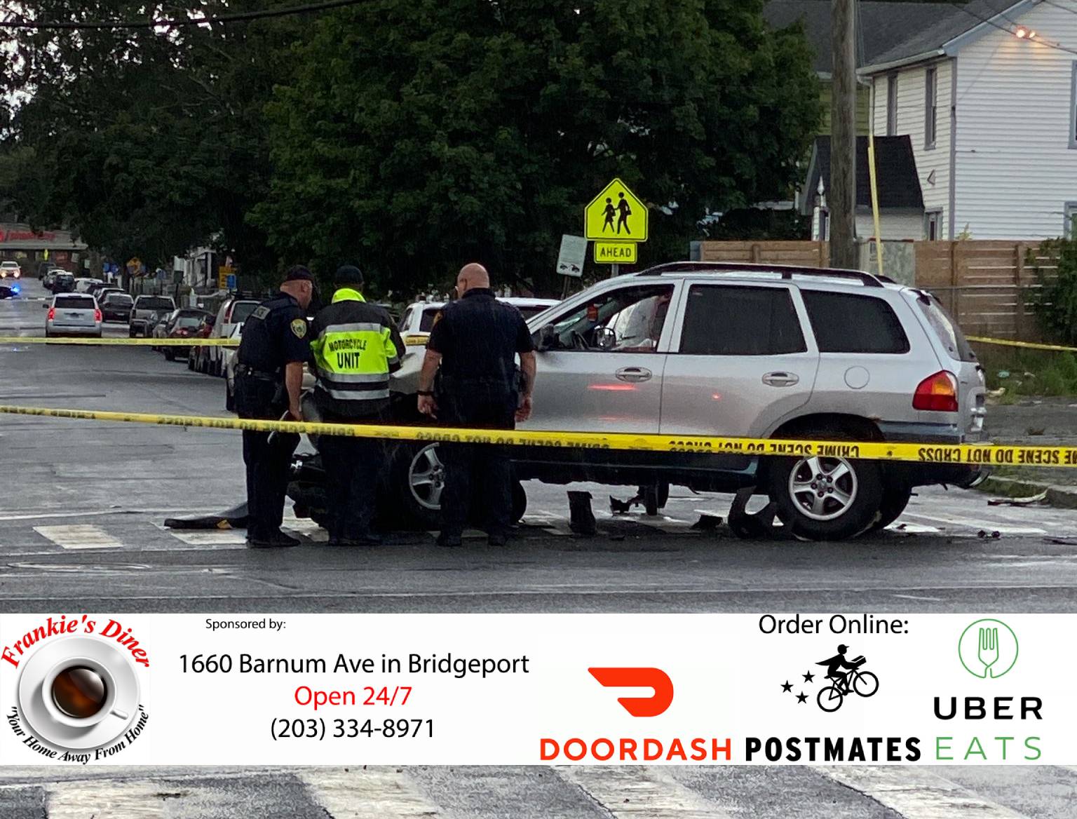 2020-07-01@6:02pm–#Bridgeport CT– Police are investigating an accident on Barnum near Willow Street in front of Frankie’ Diner. Special thanks to Nick for providing the photo. Witnesses say that one person was taken into custody in handcuffs.